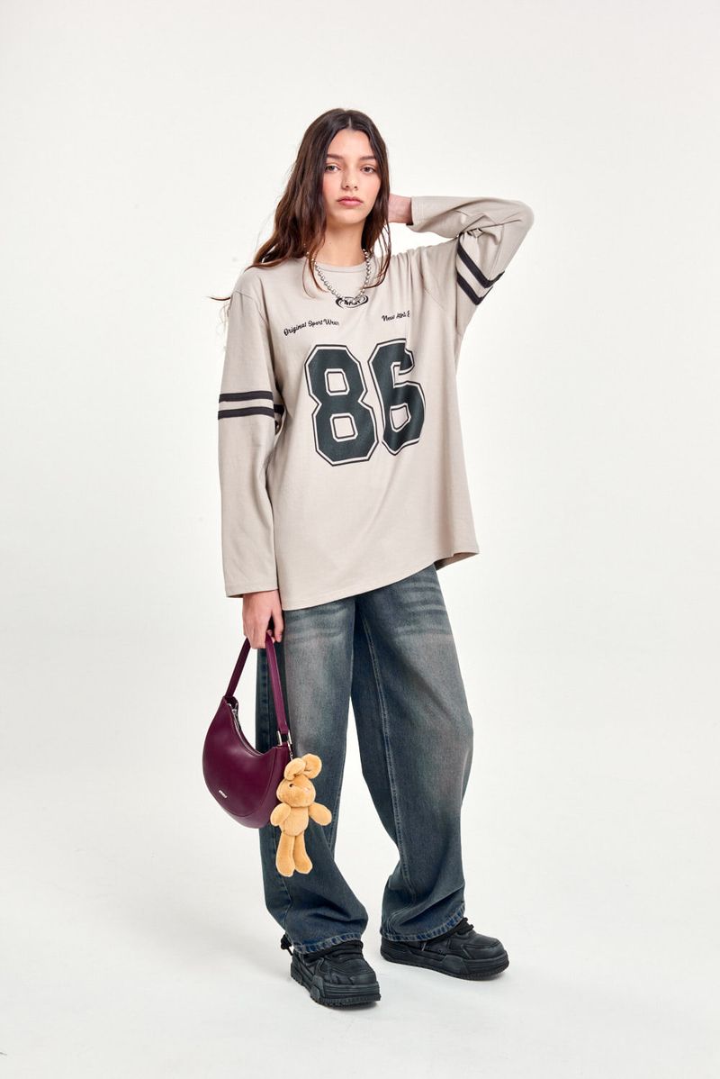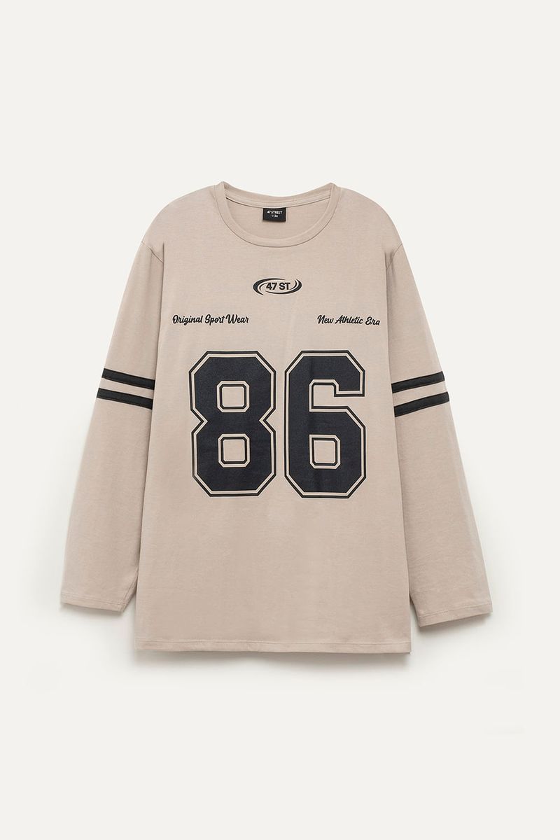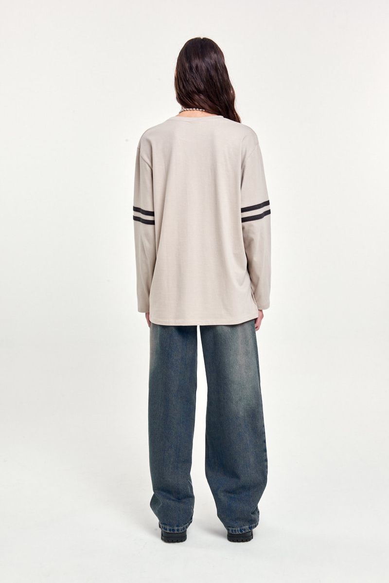 Remera manga larga de algodón pesado, con tiras a contra tono en las mangas y cuello redondo. Calce oversized. Estampa en el delantero.