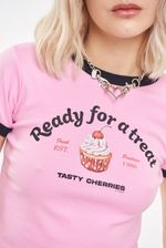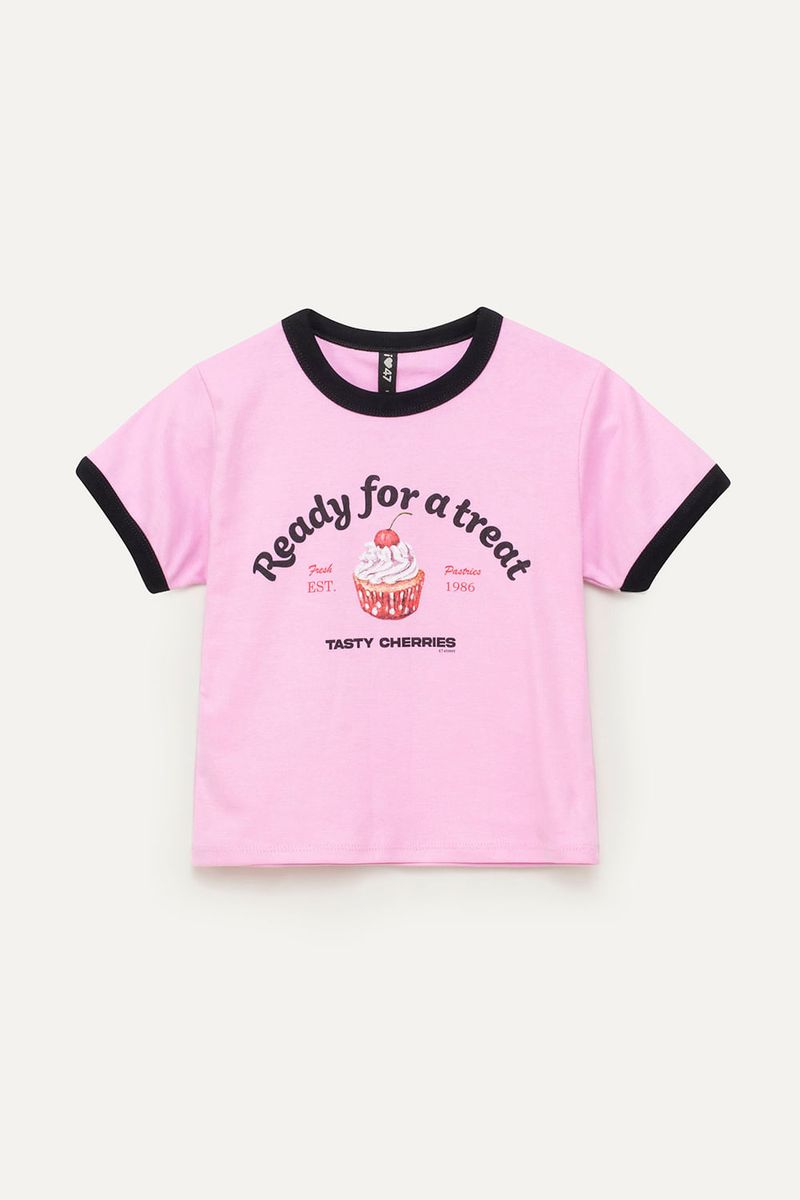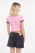 Remera basica manga corta de ribb. Cuello con terminacion de collareta a contratono idem mangas. Largo por debajo de la cintura. Estampa centrada en frente. .
