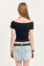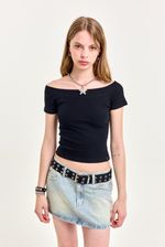 Remera de manga corta confeccionada en morley elastizado, que se ajusta al cuerpo realzando la silueta con comodidad. El escote bote y la bandeleta en ruedo la convierten en una prenda básica pero con mucha personalidad. Ideal para usar con jeans tiro bajo, faldas o como base para superposiciones.