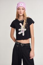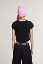 Remera de jersey liviano, largo hasta la cintura. Cuello redondo de tela base. Estampa en el frente