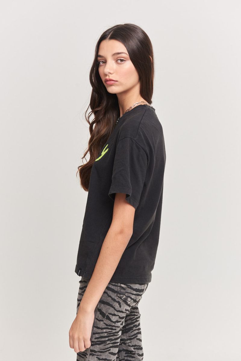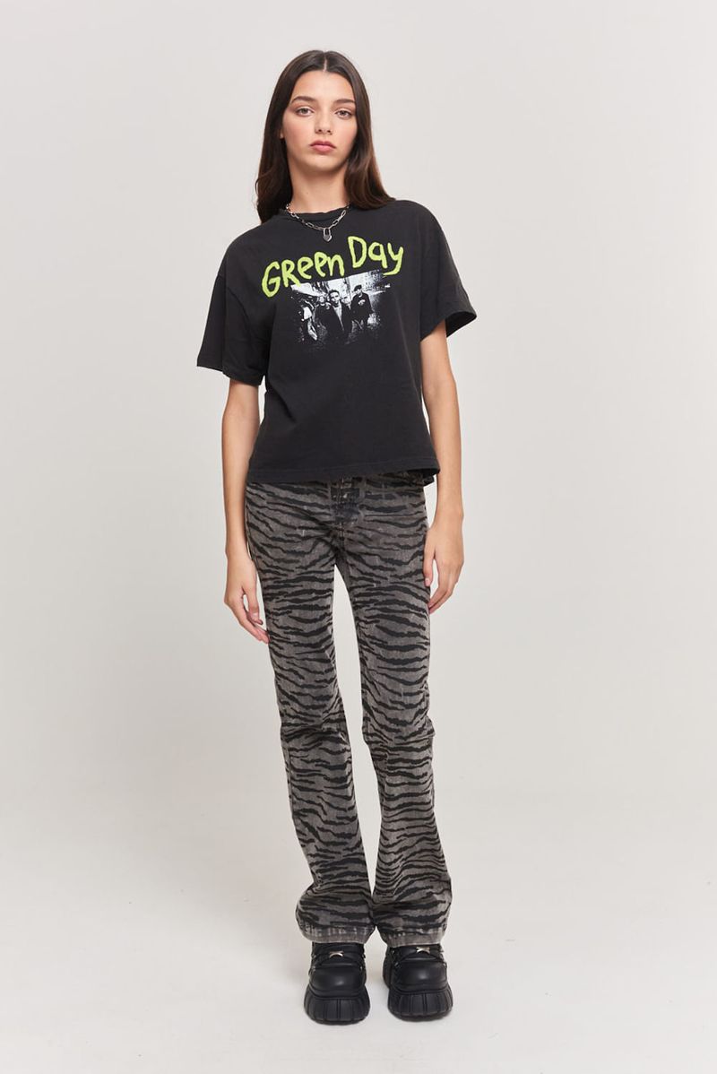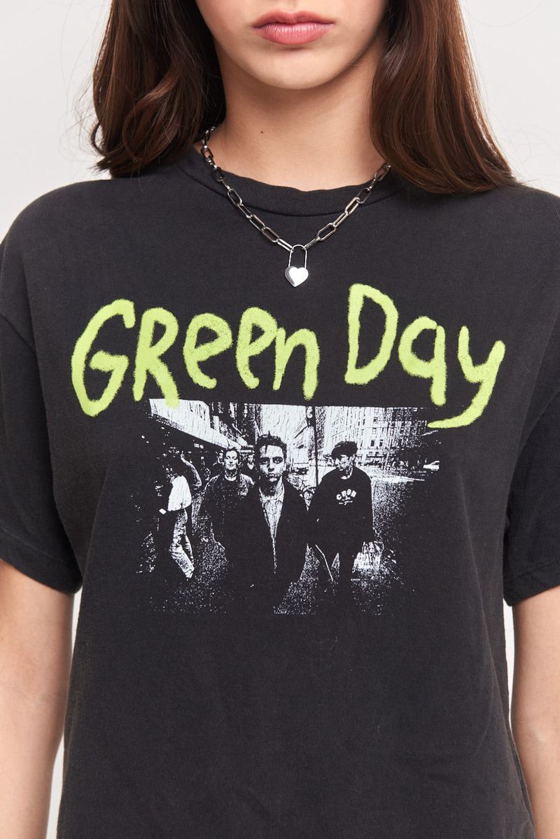 Remera manga corta de algodón corte regular, cuello redondo aplicado con estampa central de Green Day en delantero. Largo a la cintura y lavado acid wash. Lleva grifa institucional.