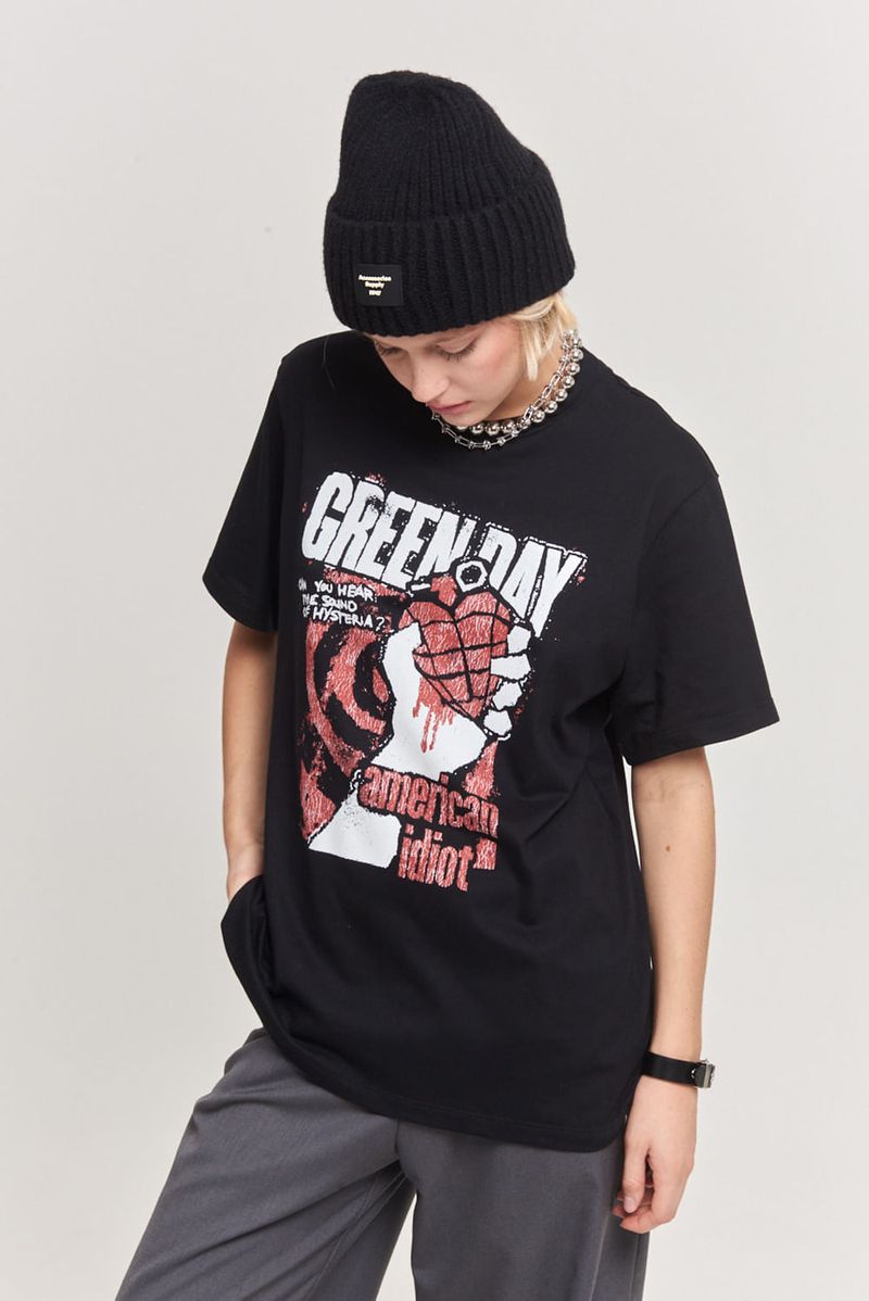 Remera manga corta de algodón con cuello aplicado. Calce oversize y estampa de Green Day en delantero. Grifa institucional.