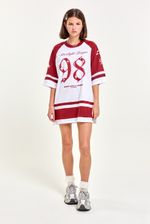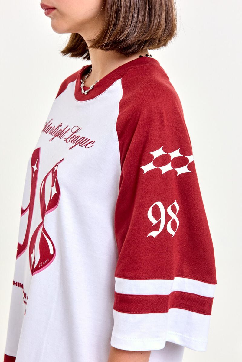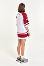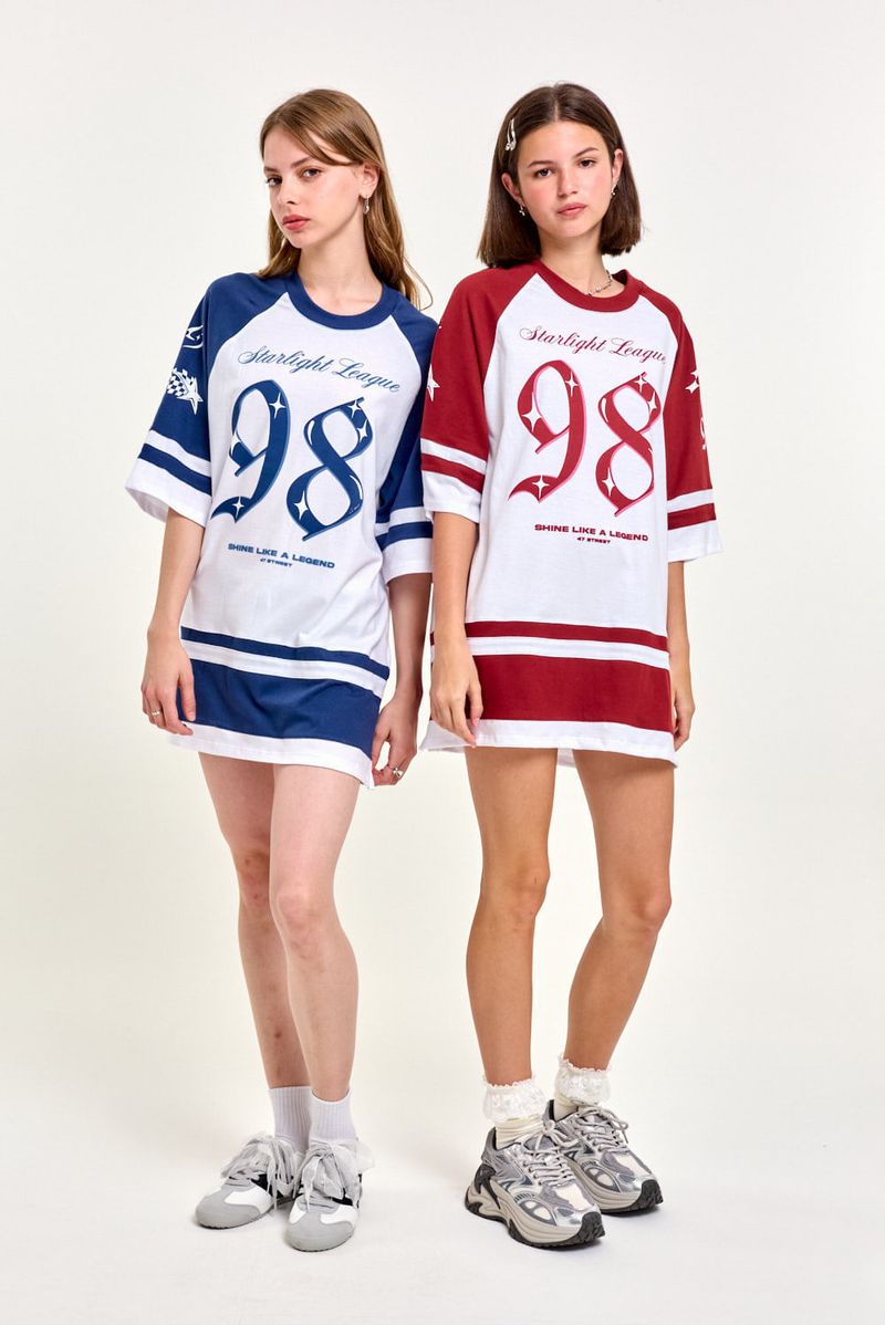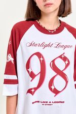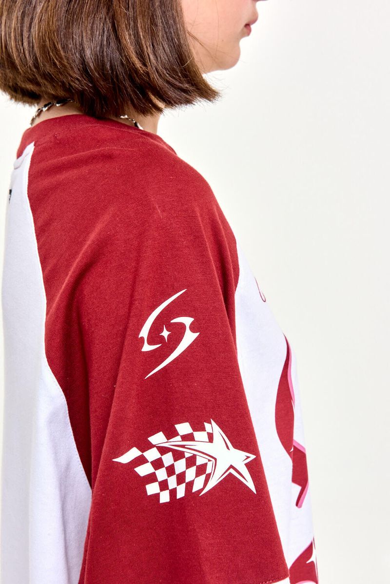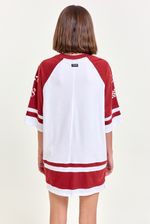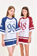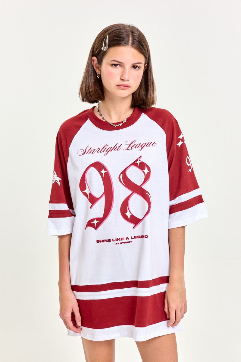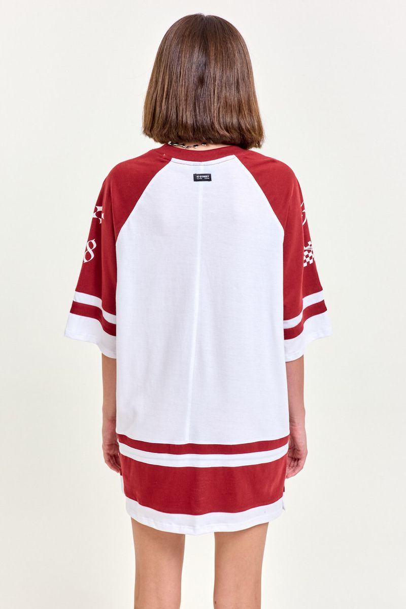 Remerón de algodón pesado con recortes a contratono y cuello aplicado. Presenta estampa frontal y en mangas, además de etiqueta tejida en la espalda. De calce amplio y estilo urbano, es ideal para un look relajado con aire deportivo. Combinalo con una biker o un jean wide leg y zapatillas.