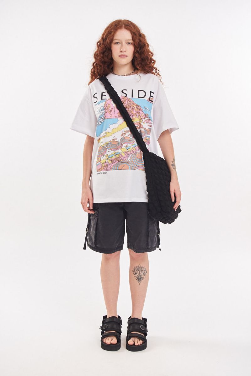 Remeron de jersey 24/1 cuello redondo manga corta. Molderia oversize. Largo por debajo de la cadera. Estampa centrada en frente.