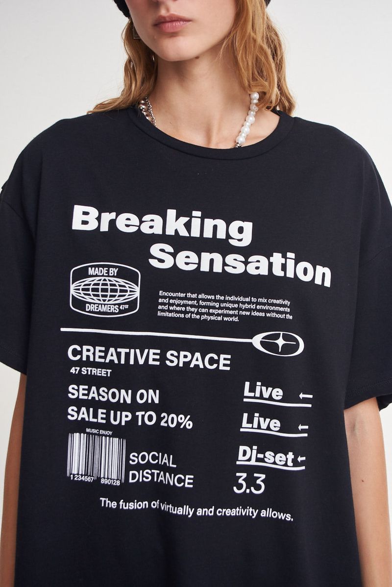 Remerón de jersey liviano con cuello redondo manga corta. Molderia oversize. Largo por debajo de la cadera. Estampa en el frente.