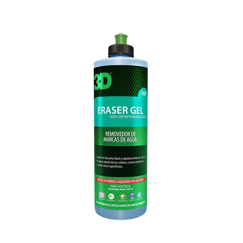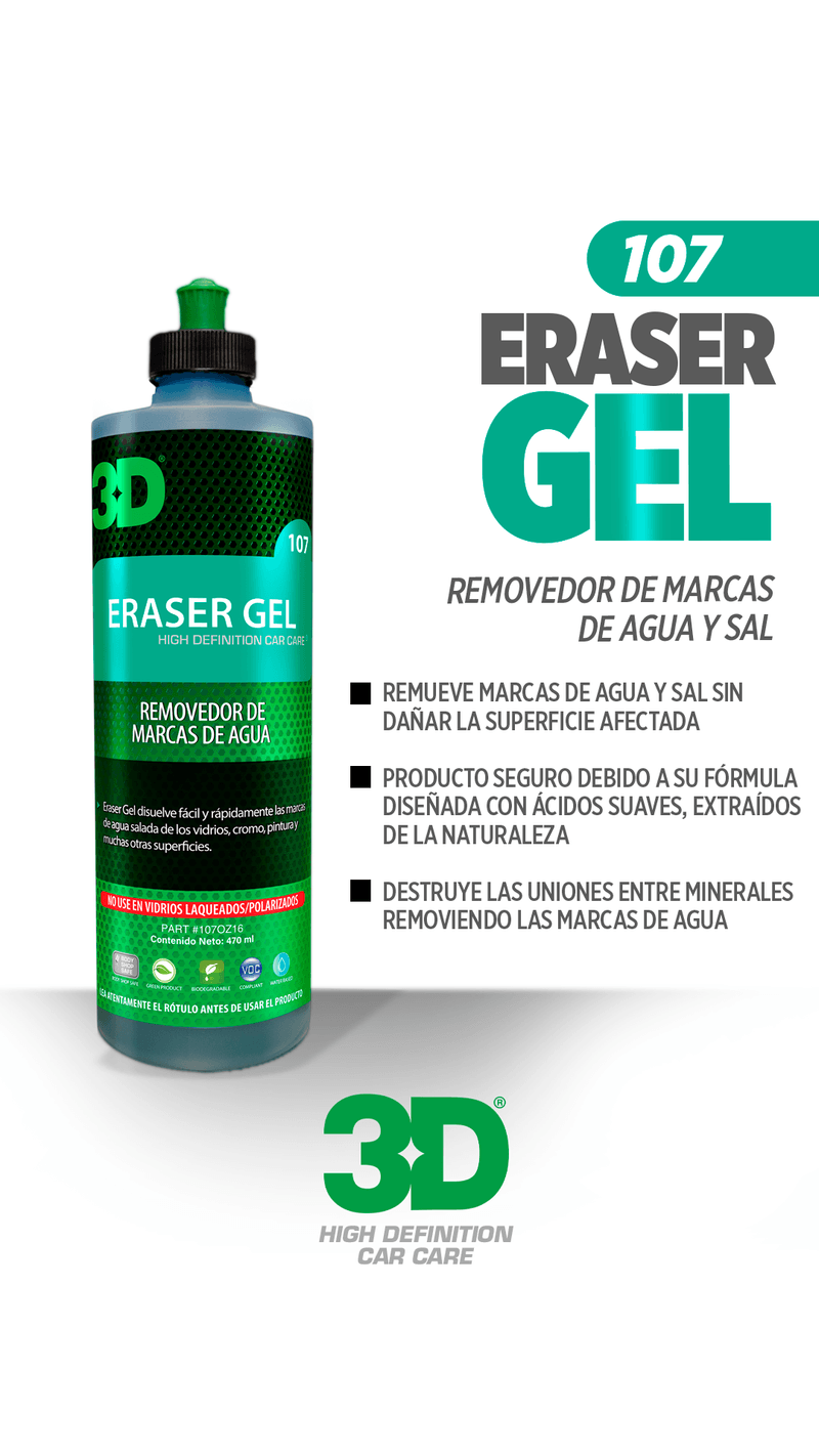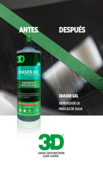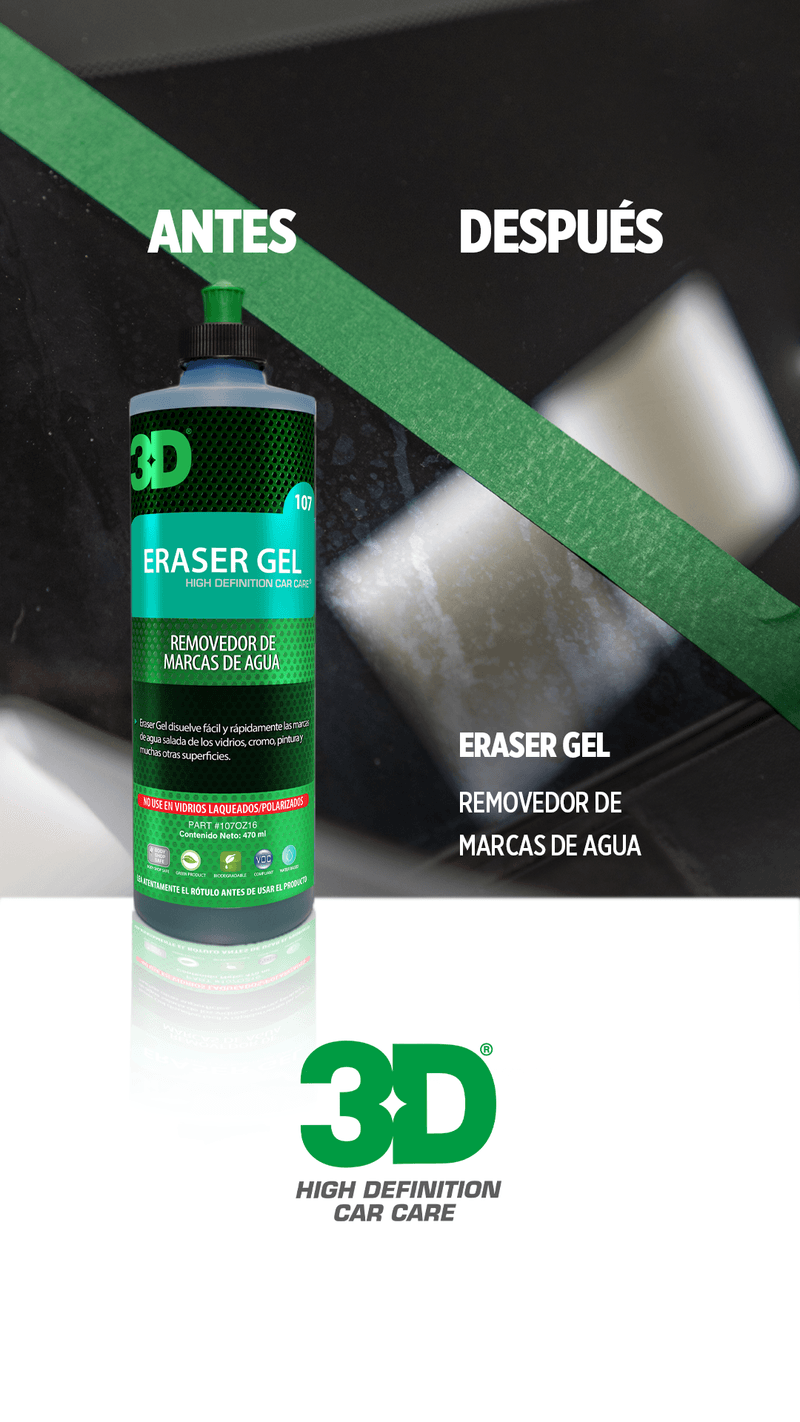 3D ERASER GEL te ayuda a recuperár claridad y estética. A causa de la evaporación del agua, se forman esas marcas visibles en cristales y pintura que manchan tu auto. Este producto, formulado con ácidos suaves, actúa eficazmente. Evidentemente, destruye las uniones minerales sin dañar la superficie, preservando la integridad original de cada parte tratada.