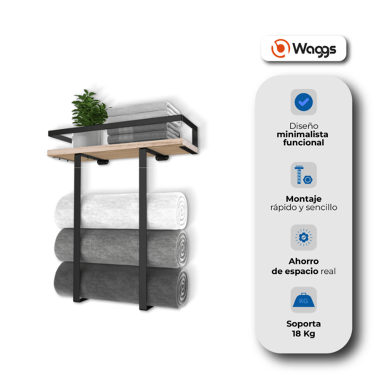 El colgador de pared WAGGS ACCB11 combina diseño, resistencia y funcionalidad en una pieza versátil que eleva cualquier ambiente. Fabricado en hierro con estante de pino natural, aprovecha el espacio vertical y se adapta a baños, cocinas, lavaderos o entradas con estética industrial y cálida. Su estante reversible ofrece tres formas de montaje —hacia afuera, hacia adentro o sin laterales— para ajustarse a tus necesidades de espacio y estilo. Soporta hasta 18 kg, ideal para toallas, frascos o decoración. Incluye tornillos, tarugos y manual-plantilla para una instalación rápida y segura. El WAGGS ACCB11 une practicidad y diseño en un solo producto: tres configuraciones, un mismo toque de elegancia.