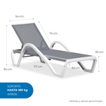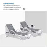 Incline la tumbona para moverse con dos ruedas en la parte inferior. Se añaden almohadillas antideslizantes en cada lado para hacer que la tumbona sea más estable cuando se mantiene en un punto estacionario.