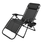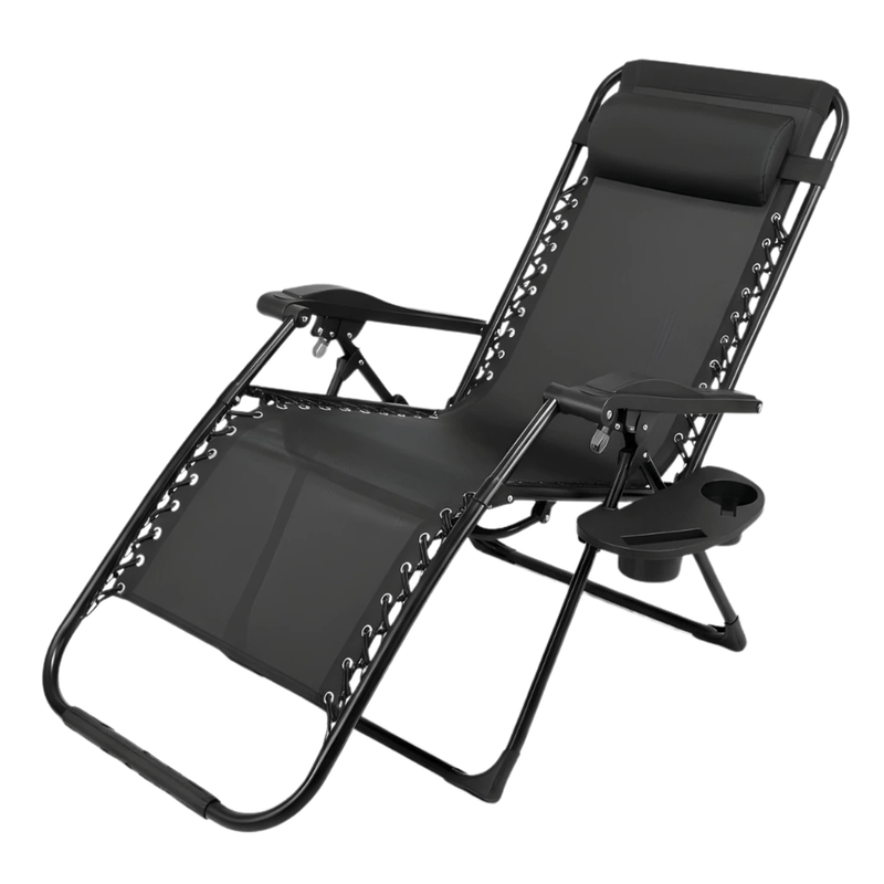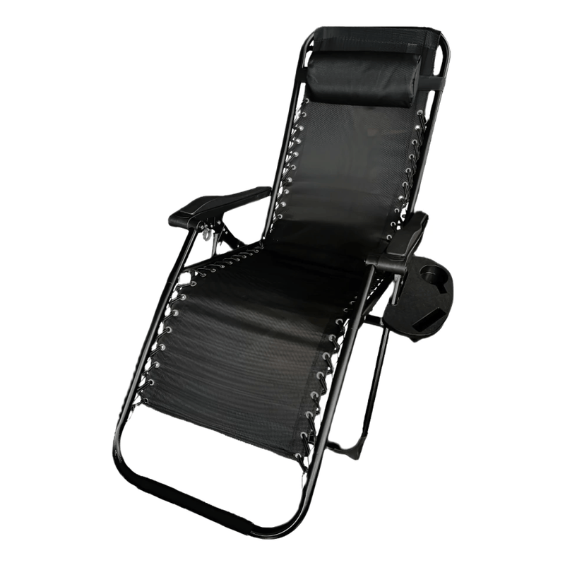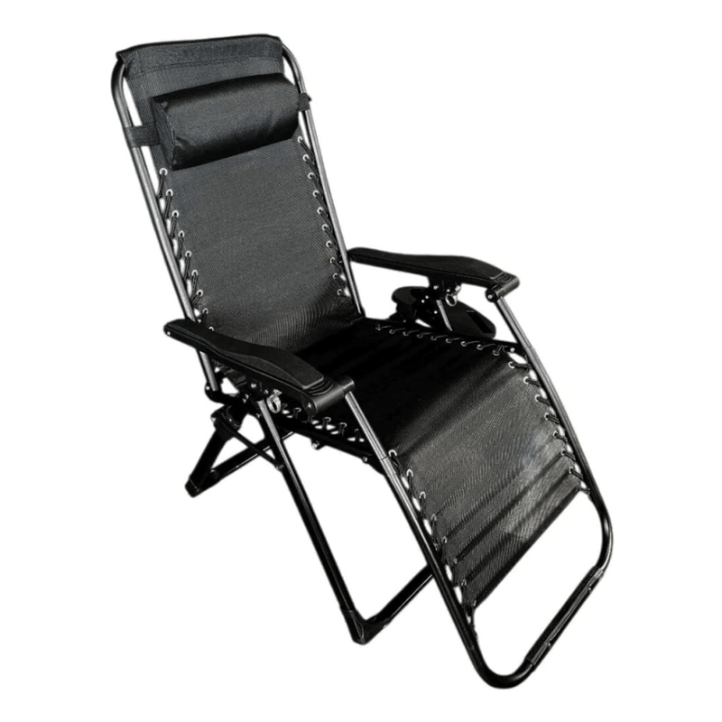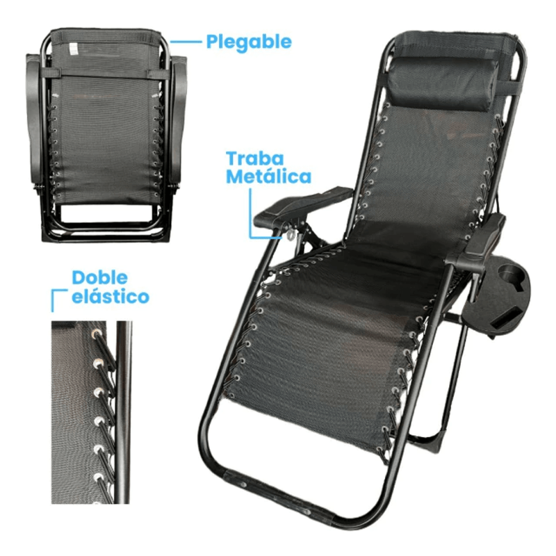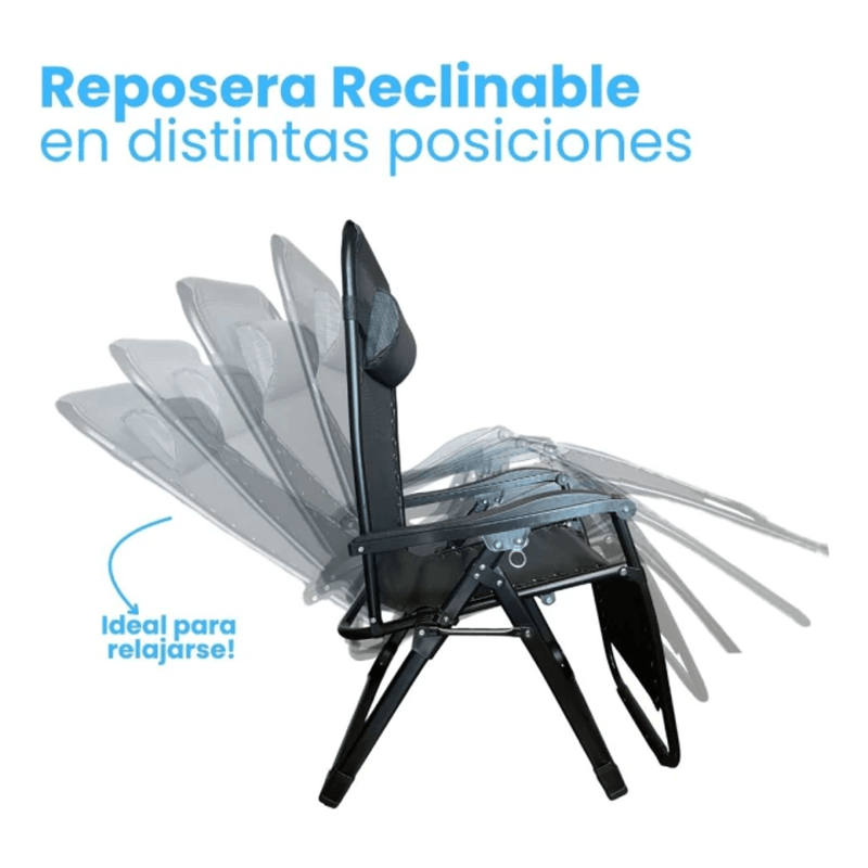Silla reclinable de gravedad cero Alpina, diseñada para brindar confort y resistencia en interior y exterior. Reclinación multiposición con respaldo, apoyapiés y portavasos, estructura de acero reforzado y tela Textilene 1x2 con protección anti-UV. Plegado rápido y compacto para transportar y guardar sin ocupar espacio.