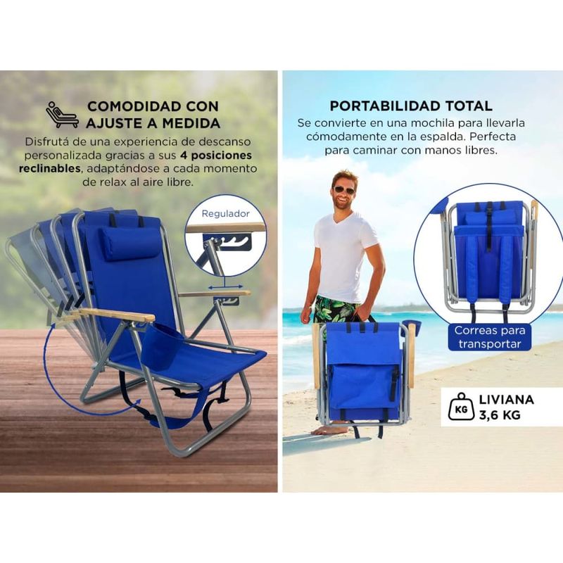 Elegí cómo querés descansar con su respaldo reclinable. Ideal para playa, camping, jardín o festival.