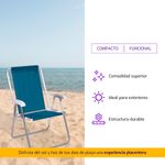 Su estructura está producida en aluminio de excelente calidad y la mampara es de poliéster con revestimiento de PVC en bonitos colores. Su respaldo más alto tiene 85,5cm de altura, sus brazos también son de aluminio de forma anatómica y, a pesar de su tamaño, es fácil de transportar por la ligereza del material.