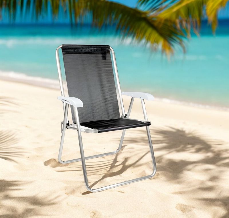 Plegable y fácil de transportar, la silla de aluminio es ideal para llevar a la playa, ya que el aluminio garantiza una mayor durabilidad,