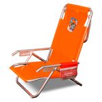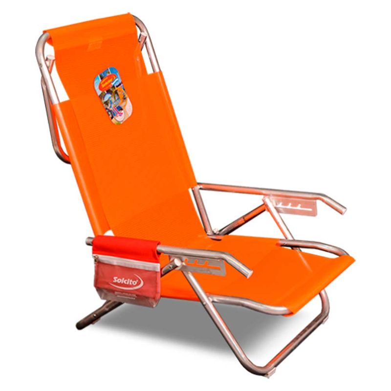Reposera de playa de cinco posiciones, su cobertura es con telas recubiertas en PVC "solwind" varios colores , construida con tubos de aluminio de 7/8". Con bolso porta objetos (bech-case). Con soporte de apoyo en el respaldo para ser utilizado en su última posición.