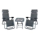 Incluye 2 reposeras con almohadon apoyacabeza Mesa con apoya vaso Color verde oscuro Regulable – reclinable Medidas: 95 x 25 x 65 cm Cuero sintetíco Acabado con pintura EPOXI Sku: 0028380202 Garantía: 6 meses
