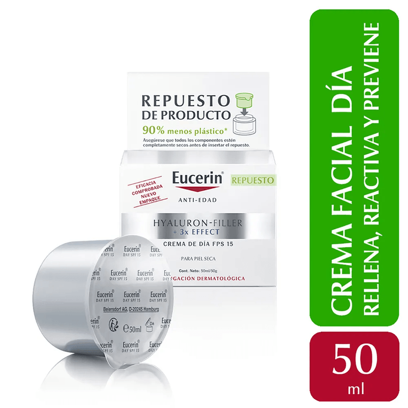 El Repuesto de la Crema antiarrugas de día Eucerin HYALURON-FILLER + 3x Effect ayuda a reducir visiblemente los signos de envejecimiento y genera un efecto relleno de arrugas para que la piel se sienta suave y cuidada. Su fórmula combina tres ingredientes: Ácido Hialurónico, Glicina Saponina y Enoxolona, que reducen a reducir arrugas, a estimular la producción de Ácido Hialurónico y a prevenir su degradación. La crema contiene FPS 15, su empaque contiene 90% menos plástico que el tarro regular y está probada para piel seca.