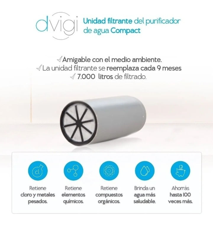 La unidad filtrante del modelo COMPACT tiene una unidad filtrante que rinde 7.000 litros, o 9 meses.