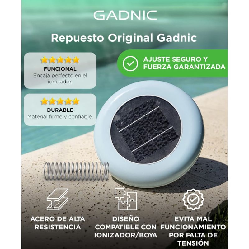 El resorte de acero Gadnic REPION15 está diseñado para garantizar que tu ionizador mantenga siempre la tensión necesaria, evitando problemas de funcionamiento y asegurando un rendimiento óptimo.