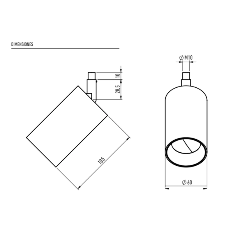 - Medidas del riel: 1000 mm x 17 mm x 34 mm, y cabezales con dimensiones de Ø60 mm x 105 mm, pensados para un diseño compacto y discreto.