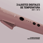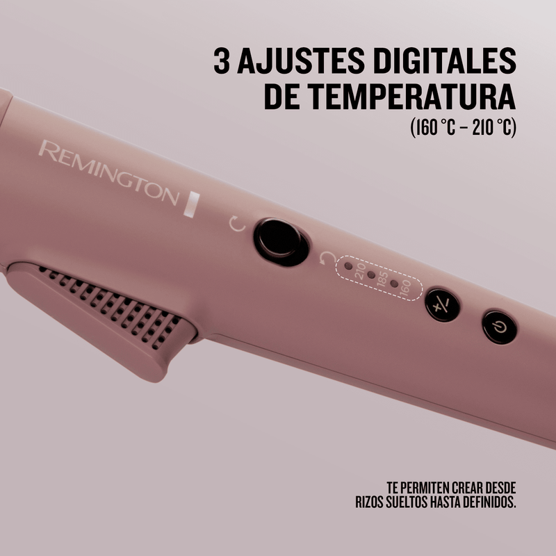 - 3 Ajustes digitales de temperatura para rizos definidos o suaves ondas.