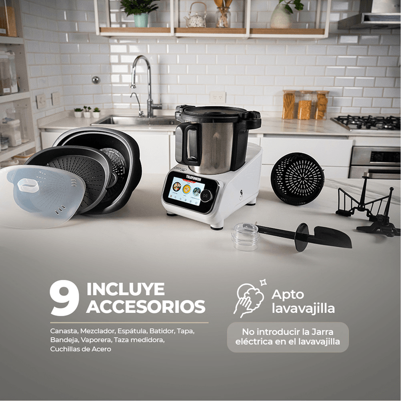 9 accesorios incluidos: Jarra, vaporera, canasta, mezclador, espátula, batidor y más.