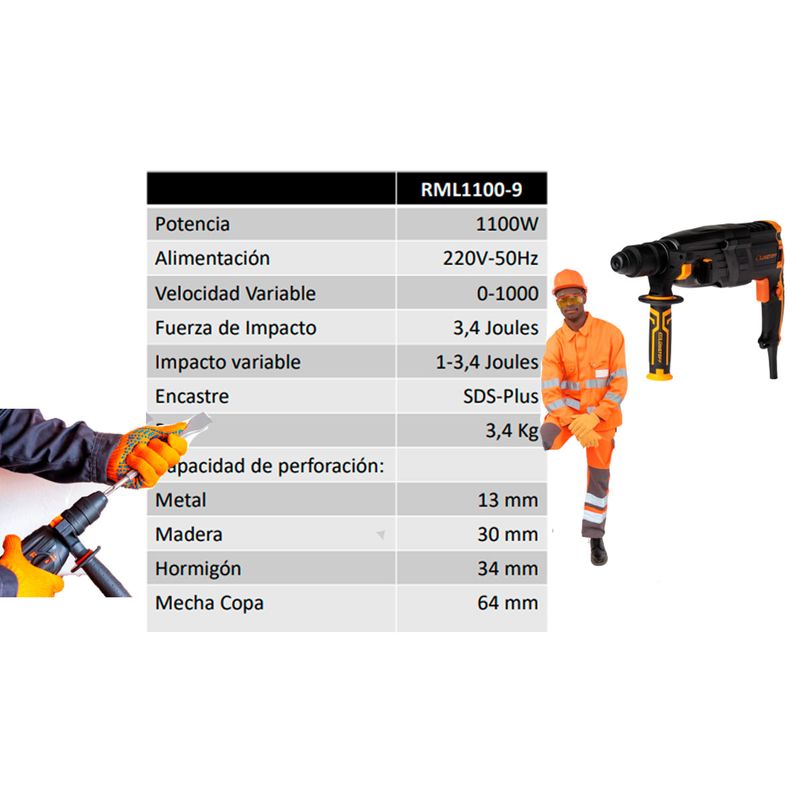 Rotomartillo 1100 W Lusqtoff RML1100-9 Con Maletín y Accesorios
