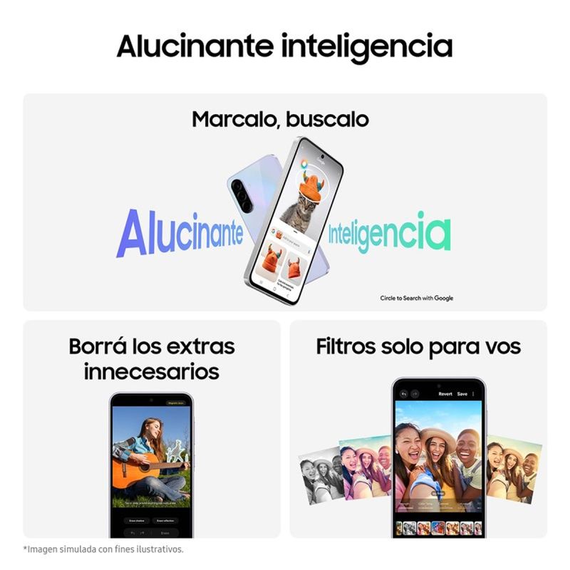 CELULAR A36 SM-A366E 5G256GB NG SAMSUNG -Tamaño de la pantalla (pantalla principal): 170,1 mm (6,7" rectángulo completo) / 165,5 mm (6,5" esquinas redondeadas) -Resolución (pantalla principal): 1080 x 2340 (FHD+) -Tecnología (pantalla principal): SuperAMOLED -Profundidad de color (pantalla principal): 16 M -Frecuencia de actualización máxima (pantalla principal): 120 Hz -Procesador: 2,4 GHz, 1,8 GHz, Octa-Core -Sistema operativo: Android -Almacenamiento/Memoria (GB): 256 -Memoria (GB): 8 -Tamaño de la SIM: Nano-SIM (4FF) -Infraestructura: 2G GSM, 3G WCDMA, 4G LTE FDD, 4G LTE TDD, 5G Sub6 FDD, 5G Sub6 TDD -Cámara trasera - Resolución (múltiple)50.0 MP + 8.0 MP + 5.0 MP, Número F (múltiple) F1.8, F2.2, F2.4 -Cámara trasera - Enfoque automático: Sí -Cámara trasera - OIS: Sí -Zoom de la cámara trasera: Zoom digital hasta 10x -Cámara frontal - Resolución 12.0 MP, Número F F2.2 -Cámara trasera - Flash: Sí -Cámara frontal - Flash: No -Resolución de grabación de video: UHD 4K (3840 x 2160) a 30 fps -Cámara lenta: 240 fps en HD -Tiempo de reproducción de video de la batería (horas): Hasta 29 -Capacidad de la batería (mAh, típica):5000 -Extraíble: No -Conectividad: -Interfaz USB: USB Tipo-C -Versión USB: USB 2.0 -Tecnología de localización: GPS, Glonass, Beidou, Galileo, QZSS -Conector para auriculares: USB Tipo-C -MHL: No -Wi-Fi 802.11a/b/g/n/ac/ax 2.4GHz+5GHz, HE80, MIMO, 1024-QAM -Wi-Fi Direct: Sí -Versión de Bluetooth: Bluetooth v5.4 -Sincronización con PC. Smart Switch(versión para PC) -Número de tarjetas SIM: SIM única -Tipo de ranura: SIM 1 -Formato: Touch Bar -Sensores: Acelerómetro, sensor de huellas dactilares, sensor giroscópico, sensor geomagnético, sensor de luz, sensor de proximidad virtual -Compatibilidad con audio y video estéreo: Sí -Formatos de reproducción de video: MP4, M4V, 3GP, 3G2, AVI, FLV, MKV, WEBM -Resolución de reproducción de video: UHD 4K (3840 x 2160) a 30 fps -Formatos de reproducción de audio: MP3, M4A, 3GA, AAC, OGG, OGA, WAV, AMR, AWB, FLAC, MID, MIDI, XMF, MXMF, IMY, RTTTL, RTX, OTA -Services and Applications Gear SupportGalaxy Ring,Galaxy Buds3 Pro,Galaxy Buds2 Pro,Galaxy Buds Pro,Galaxy Buds Live,Galaxy Buds+,Galaxy Buds3,Galaxy Buds2,Galaxy Buds,Galaxy Buds FE,Galaxy Fit3,Galaxy Fit2,Galaxy Fit e,Galaxy Fit,Galaxy Watch FE,Galaxy Watch Ultra,Galaxy Watch7,Galaxy Watch6,Galaxy Watch5,Galaxy Watch4,Galaxy Watch3,Galaxy Watch,Galaxy Watch Active2,Galaxy Watch Active -SmartThings Support Yes -Bluetooth_ Hearing Aid Support: Android Audio Streaming for Hearing Aid(ASHA) -Dimensiones (Alto x Ancho x Profundidad, mm): 162,9 x 78,2 x 7,4 -Peso (g): 195 -Color Awesome Black -Modelo A36 SM-A366E -Garantía fabricante 12 meses -Origen Argentina