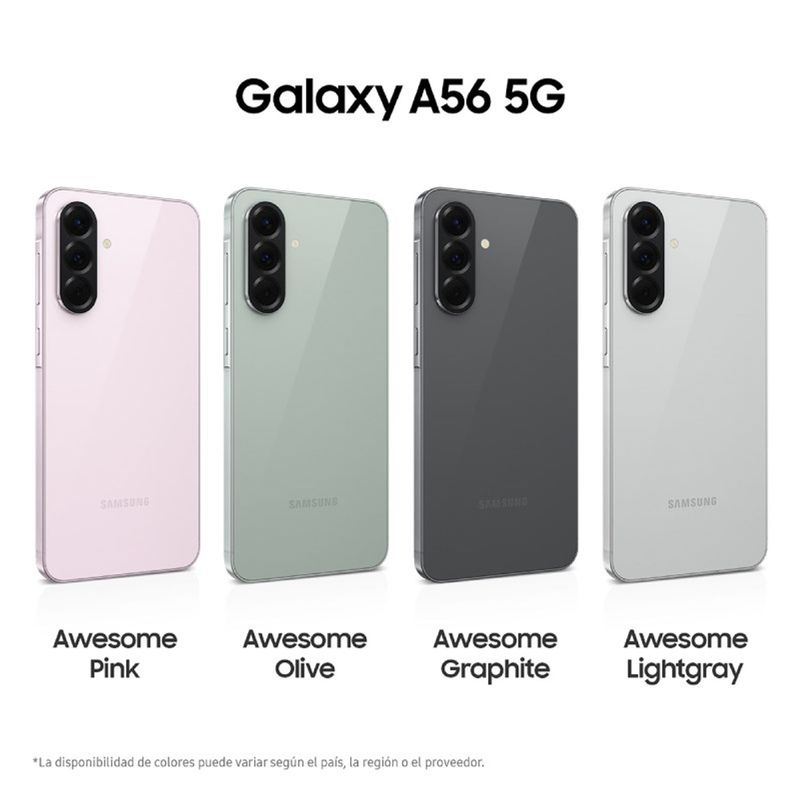 CELULAR A56 SM-A566E 5G SAMSUNG -Tamaño de pantalla (pantalla principal): 170.1 mm (6.7" rectángulo completo) / 165.5 mm (6.5" esquinas redondeadas) -Resolución (pantalla principal): 1080 x 2340 (FHD+) -Tecnología (pantalla principal): SuperAMOLED -Profundidad de color (pantalla principal): 16 M -Frecuencia de actualización máxima (pantalla principal): 120 Hz -Procesador: Octa-Core, Velocidad de CPU: 2.9 GHz, 2.6 GHz, 1.9 GHz -Almacenamiento/Memoria: 256 GB -Memoria: 8 GB -Compatibilidad con almacenamiento externo: No disponible -Cámara trasera - Resolución (múltiple): 50.0 MP + 12.0 MP + 5.0 MP, Número F (múltiple): F1.8, F2.2, F2.4 -Cámara trasera - Enfoque automático: Sí -Cámara trasera - OIS: Sí -Zoom de la cámara trasera: Zoom digital de hasta 10x -Cámara frontal: Resolución de 12.0 MP,Número F: F2.2 -Cámara trasera: Flash: Sí -Resolución de grabación de video: UHD 4K (3840 x 2160) a 30 fps -Cámara lenta: 240 fps a HD -Infraestructura: 2G GSM,3G WCDMA,4G LTE FDD,4G LTE TDD,5G Sub6 FDD,5G Sub6 TDD -Conectividad: -Interfaz USB: USB Tipo-C, Versión 2.0 -Tecnología de localización: GPS, Glonass, Beidou, Galileo, QZSS -Conector para auriculares: USB Tipo-C -Wi-Fi 802.11a/b/g/n/ac/ax 2.4GHz+5GHz, HE80, MIMO, 1024-QAM -Wi-Fi Direct: Sí -Versión de Bluetooth: Bluetooth v5.3 -Sincronización con PC: Smart Switch(versión para PC) -Sistema operativo: Android -Número de SIM: Dual-SIM -Tipo de ranura: SIM 1 + eSIM -Formato: Touch Bar -Sensores: Acelerómetro, sensor de huellas dactilares, sensor giroscópico, sensor geomagnético, sensor de luz, sensor de proximidad virtual -Tiempo de reproducción de video con batería (horas): Hasta 29 -Capacidad de la batería (mAh, típica):5000 -Compatibilidad con audio y video estéreo: Sí -Formato de reproducción de video: MP4,M4V, 3GP, 3G2, AVI, FLV, MKV, WEBM -Resolución de reproducción de video: UHD 4K (3840 x 2160) a 60 fps -Formato de reproducción de audio: MP3,M4A, 3GA, AAC, OGG, OGA, WAV, AMR, AWB, FLAC, MID, MIDI, XMF, MXMF, IMY, RTTTL, RTX, OTA -Servicios y aplicaciones: Compatibilidad con dispositivos Galaxy Ring, Galaxy Buds 3 Pro, Galaxy Buds 2 Pro, Galaxy Buds Pro, Galaxy Buds Live, Galaxy Buds+, Galaxy Buds 3, Galaxy Buds 2, Galaxy Buds, Galaxy Buds FE, Galaxy Fit 3, Galaxy Fit 2, Galaxy Fit e, Galaxy Fit, Galaxy Watch FE, Galaxy Watch Ultra, Galaxy Watch7, Galaxy Watch6, Galaxy Watch5, Galaxy Watch4, Galaxy Watch3, Galaxy Watch, Galaxy Watch Active2, Galaxy Watch Active -Compatible con SmartThings: Sí -Dimensión(mm) 162.2 x 77.5 x 7.4 -Peso(g) 198 -Color Awesome Lightgray -Modelo SM-A566E -Garantía fabricante 12 meses -Origen Argentina