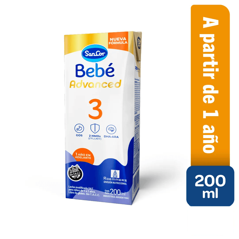 SanCor Bebé 3 Advanced es leche modificada UAT, para niños de 1 a 2 años. Libre de gluten.