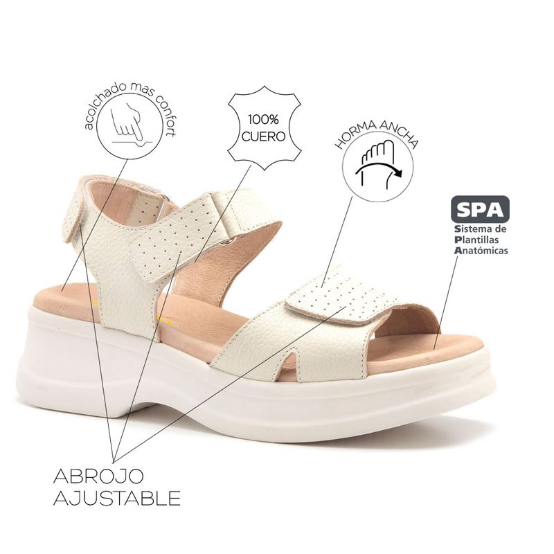 Disfruta de la máxima comodidad con nuestra elegante sandalia de cuero. Con una plantilla anatómica que ofrece realce en el arco, soporte metatarsal y almohadilla en el área del oliva, proporciona un ajuste óptimo y un soporte excepcional. Forrada completamente en cuero, asegura suavidad y durabilidad. Equipadas con dos abrojos, uno en el tobillo y otro en la tira a la altura del metatarso, garantizan un ajuste seguro y personalizado. Su horma ancha y confortable es perfecta para todo el día. Ideal para quienes buscan una combinación de estilo y confort.