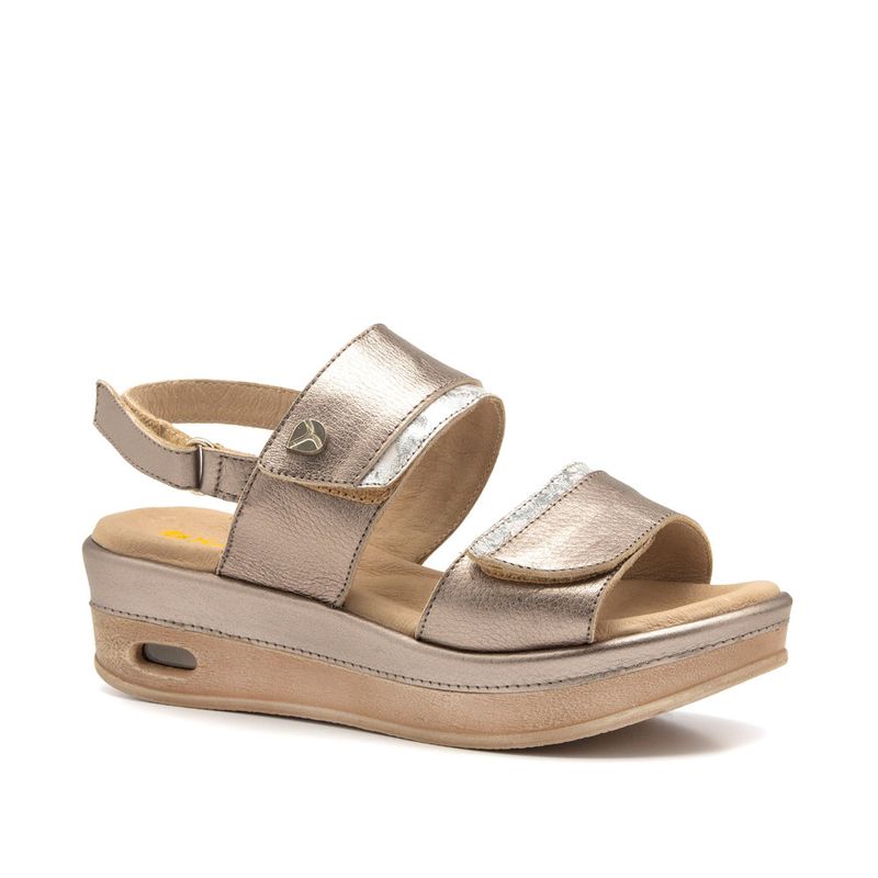 Sandalia de cuero con plataforma con cámara de aire. Ajustable al pie gracias a sus tres velcros en empiene, metatarso y talón. Enteramente en cuero genuino, capellada y forro. Son muy livianas!