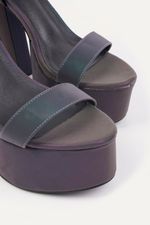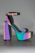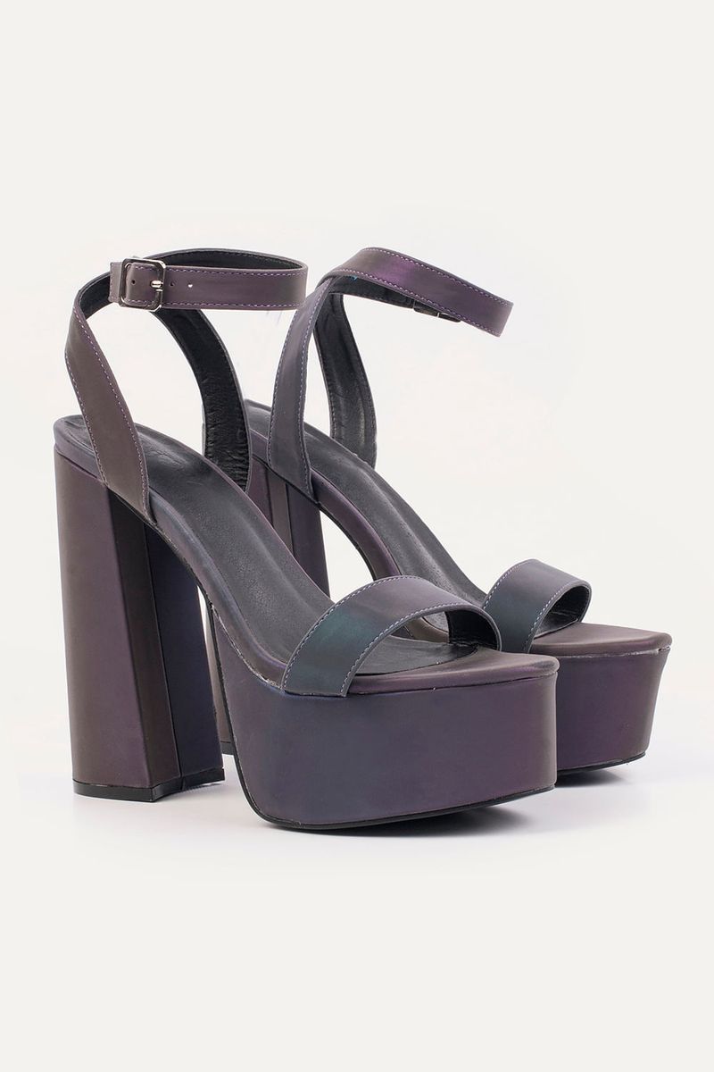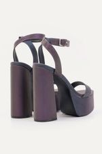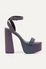 Sandalia con plataforma de 5 cm. Taco de 14,5 cm. Material: nylon reflectivo. Con pulsera regulable.