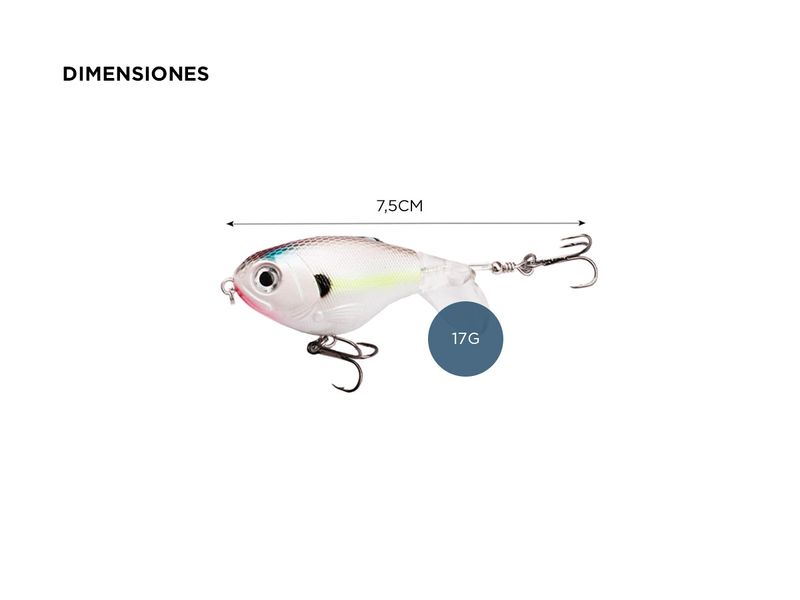 El cebo artificial cuenta con una cola giratoria suave que produce un sonido y una acción que llaman la atención de los peces en el agua. Además, su tamaño de 75mm y su peso de 17g lo hacen perfecto para atrapar peces de tamaño medio y grande.