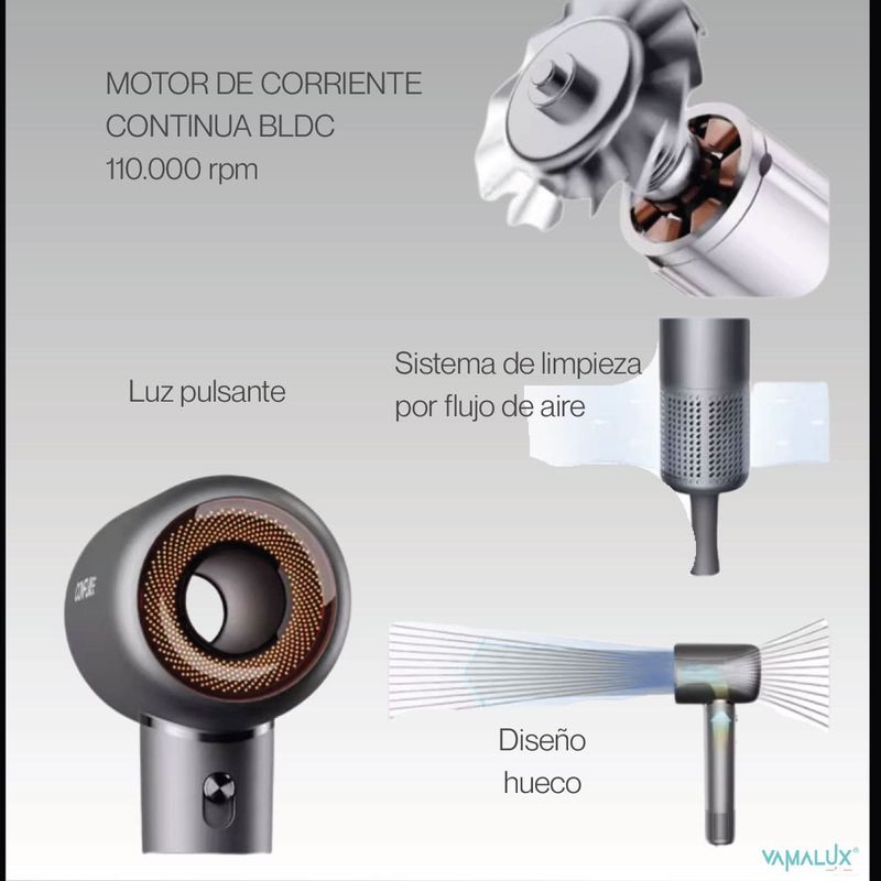 Motor BLDC de Ultra Alta Velocidad y Precisión: Cuenta con un Motor BLDC (sin escobillas) de alta durabilidad y eficiencia, alcanzando 110.000 rpm. Esto se traduce en un flujo de aire potentísimo y preciso, permitiendo un secado más rápido y un control superior sobre el peinado.