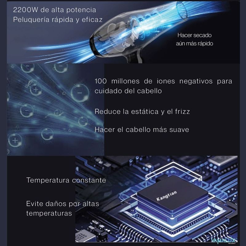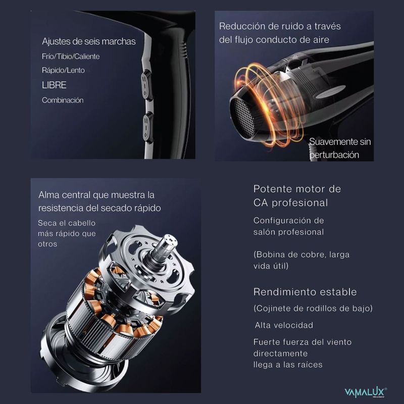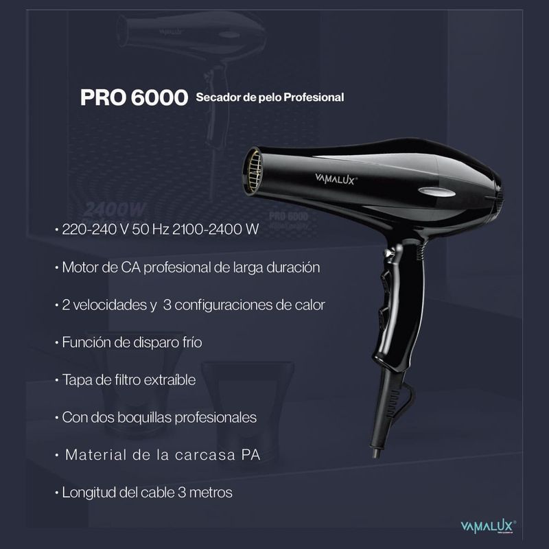 Secador De Pelo Vamalux PRO6000 Profesional: 2400W, Motor AC de Larga Duración y Cable 3 Mts