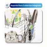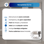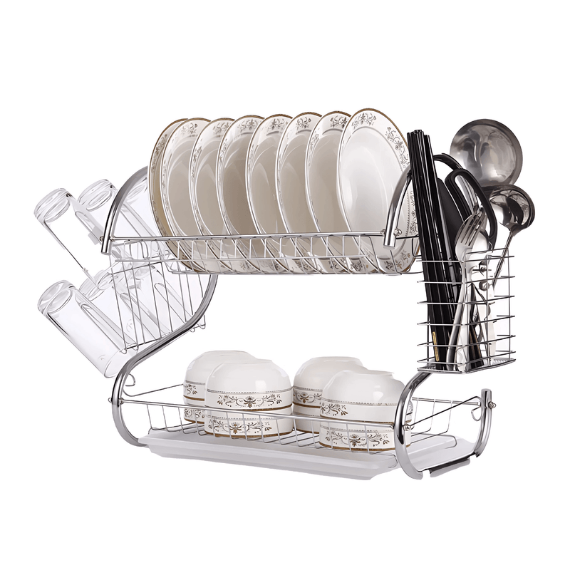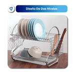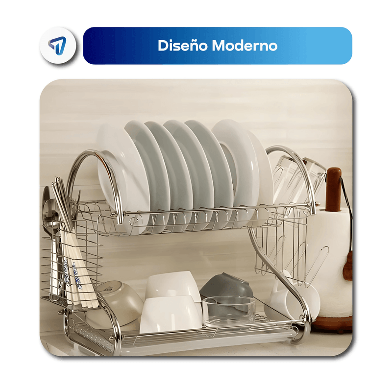 El escurridor de platos WAGGS es un accesorio de cocina de dos niveles con un acabado cromado que optimiza el espacio y añade elegancia. Su diseño permite organizar hasta 17 platos, 6 vasos y cubiertos de forma eficiente, mientras que la bandeja recolectora de agua evita el desorden y la humedad. Fabricado en acero cromado resistente al óxido, es duradero y fácil de mantener. Incluye soporte para cubiertos y vasos. Dimensiones: 34 x 35 x 24 cm. Peso: 1 kg. Ideal para mantener tu cocina ordenada y limpia.