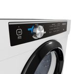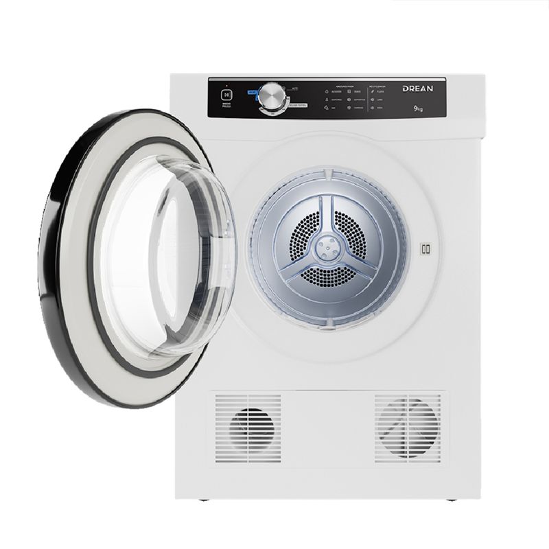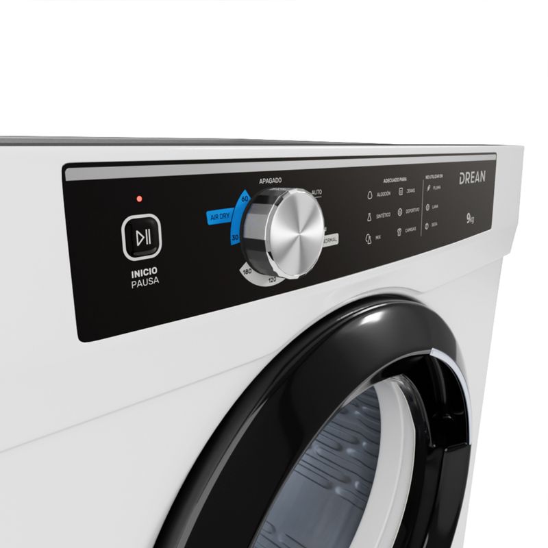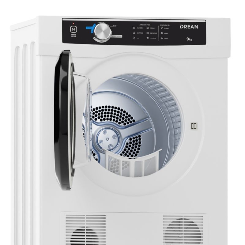 Secarropas por calor de carga frontal. Color blanco. Capacidad de secado de 9 Kg. Tambor interior de acero inoxidable. Programas Air dry de 30 y 60’ con aire fresco, programa Auto que detecta los niveles de humedad en la ropa y detiene el proceso cuando las prendas están secas, y programas de secado por calor de 30, 60, 120 y 180’. Display LED con protección conformal coating y perilla. Tecnología Antiarrugas. Sistema de instalación dual con opción de salida de aire al exterior. Origen China.