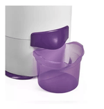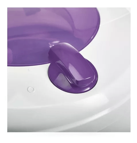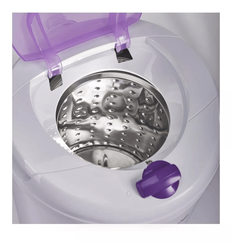 Cuenta con tambor de acero y camisa exterior de polipropileno en color blanco/violeta. Su diseño compacto, con 65,2 cm de alto y un diámetro aproximado de 34,3 cm, facilita la instalación en espacios reducidos. Incluye tapa traslúcida, salida inferior con boquilla de desagote y recipiente recolector de agua para un uso más ordenado.