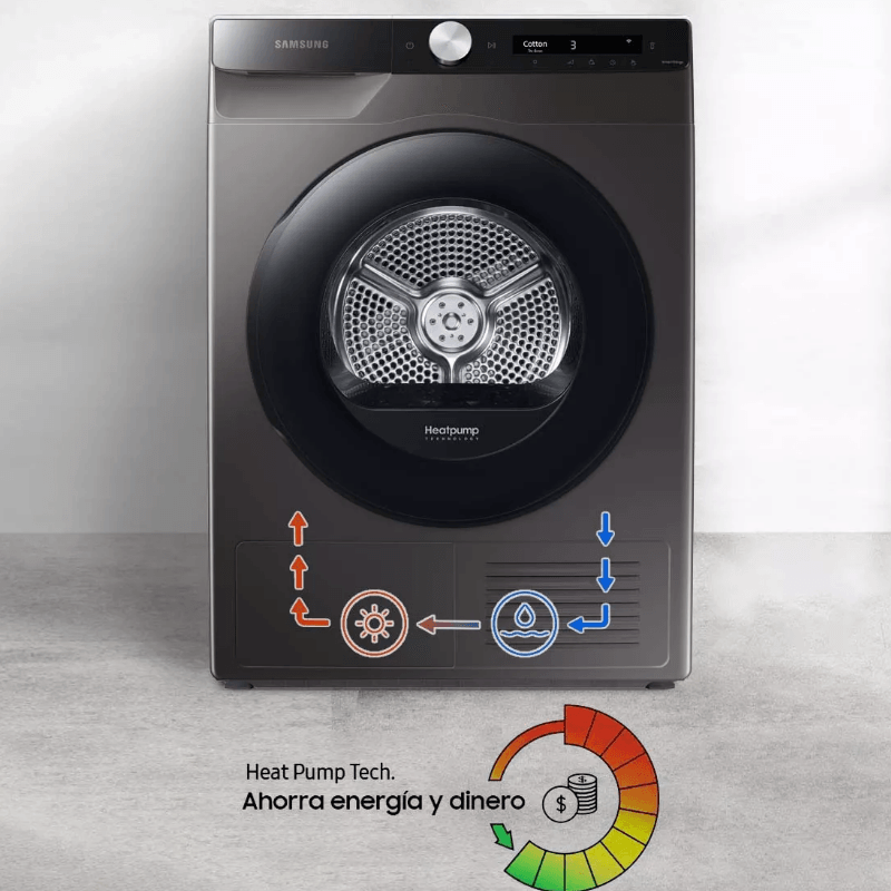 La tecnología de bomba de calor ofrece una forma energéticamente eficiente, rentable y suave de secar la ropa. Utiliza 'refrigerante' en lugar de electricidad para calentar el aire y recicla el aire caliente para evitar el desperdicio de energía