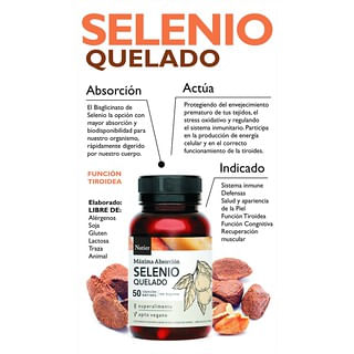 El selenio es un mineral vital para el cuerpo humano que tiene numerosas funciones. Aumenta la inmunidad, participa en la actividad antioxidante, defiende al organismo contra el daño de los radicales libres y la inflamación. Juega un papel clave en el mantenimiento saludable del metabolismo. Se encuentra naturalmente en el suelo y en ciertos alimentos, incluso pequeñas cantidades en el agua. Es un mineral esencial para la inmunidad, la piel y la tiroides, entre otras funciones. Se encuentra presente en muchos alimentos, pero los suelos de cultivo se han ido empobreciendo de selenio en el paso de los últimos siglos, y algunos vegetales son deficientes en este mineral. Por eso una parte de la población puede no llegar a cubrir los requerimientos mínimos. El Bisglicinato de Selenio es el suplemento orgánico con mayor absorción y biodisponibilidad para nuestro organismo. Es un mineral orgánico quelado que rápidamente es digerido por nuestro cuerpo y utilizado completamente sin residuos.
