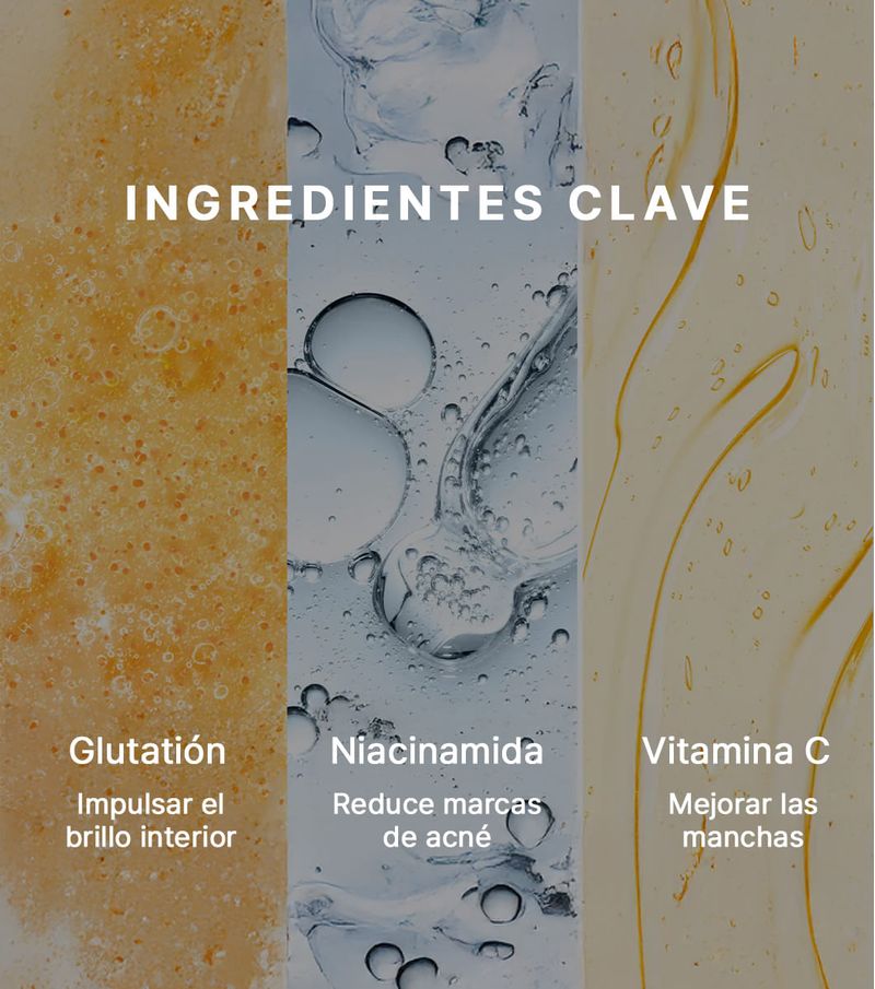 Este serum corrector de manchas ofrece resultados visibles en solo 3 días gracias a su potente combinación de 5% de Glutatión vehiculizado en exosomas, 5% de Niacinamida (Vitamina B3) y 5% de Vitamina C, atenuando manchas oscuras, puntos negros, marcas del acne, tono desigual e hiperpigmentación, para una piel más radiante. Su fórmula hipoalergenica, libre de fragancias, ligera y de rápida absorción, hidrata profundamente y repara la barrera cutánea, dejando la piel jugosa y suave. Ideal para pieles secas, sensibles y mixtas.