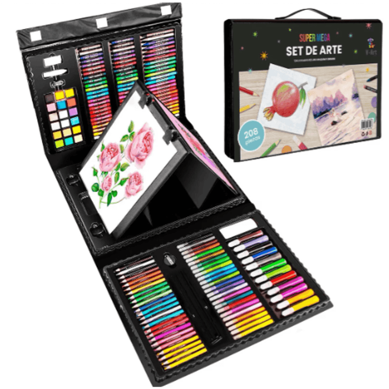 Despierta el talento artístico con el exclusivo set de arte, una completa estación de creatividad portátil que incluye 208 piezas de alta calidad para dibujar y pintar sin límites. Este maletín con medidas de 41 x 30 x 5 cm, se distingue por su diseño que incorpora un caballete plegable de doble cara, permitiendo que dos personas dibujen simultáneamente o que el artista cree cómodamente en cualquier lugar sin necesidad de una mesa adicional. El kit es totalmente seguro y no tóxico, y contiene una inmensa variedad de herramientas organizadas: desde marcadores finos y gruesos, lápices de colores y crayones, hasta pasteles al óleo, acuarelas, hojas de dibujo y accesorios esenciales como clips, regla, goma y sacapuntas. Es la opción ideal para mantener el orden y llevar la diversión a todas partes gracias a su formato de valija con cierre de velcro y manija de transporte.