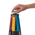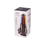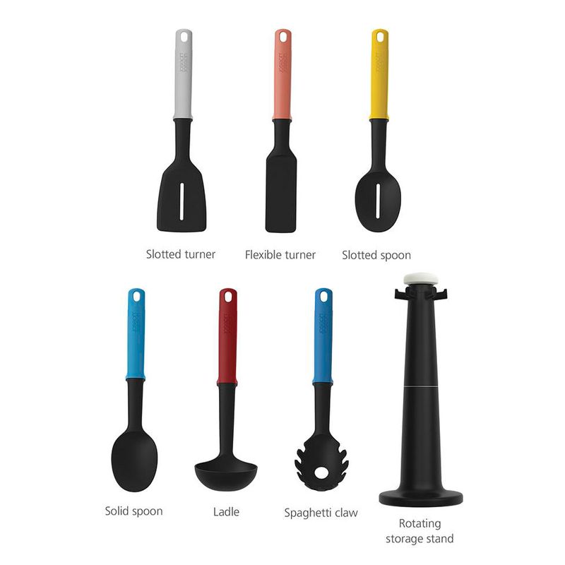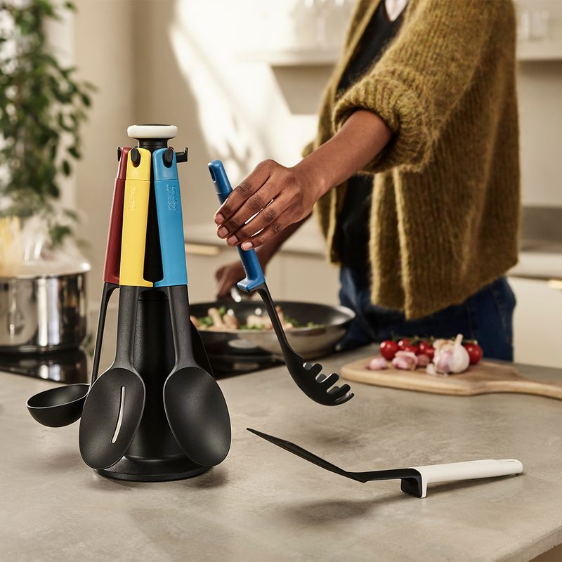 Diseñados con mangos pesados y soportes para herramientas integrados, nuestros utensilios Elevate™ minimizan el desorden en la cocina al mantener la cabeza del utensilio levantada cuando se coloca hacia abajo. El carrusel Elevate™ incluye una cuchara ranurada, un servidor de espagueti, una cuchara sólida, un volteador ranurado, un volteador flexible y un cucharón, todos con cabezales de nylon y mangos ergonómicos y resistentes al calor. El carrusel giratorio garantiza que cada utensilio sea fácil de agarrar cuando lo necesite.