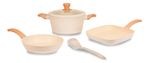 El set de batería Carol de 5 piezas con espátula de nylon de la línea Granito ofrece una solución completa y elegante para tu cocina. Este conjunto incluye una cacerola de 24 cm, una sartén de 24 cm y una bifera acanalada de 27 cm, ideal para asar y marcar carnes y otros alimentos. Todas las piezas presentan un sofisticado acabado Granito que combina estilo con una superficie antiadherente de alta calidad, garantizando una cocción uniforme y una limpieza sin esfuerzo. Además, se incluye una espátula de nylon para utilizar con seguridad en las superficies antiadherentes. El set viene empaquetado en una caja de cartón corrugado, proporcionando una excelente protección durante el transporte y el almacenamiento. Este set es perfecto para quienes buscan funcionalidad y diseño en sus utensilios de cocina.