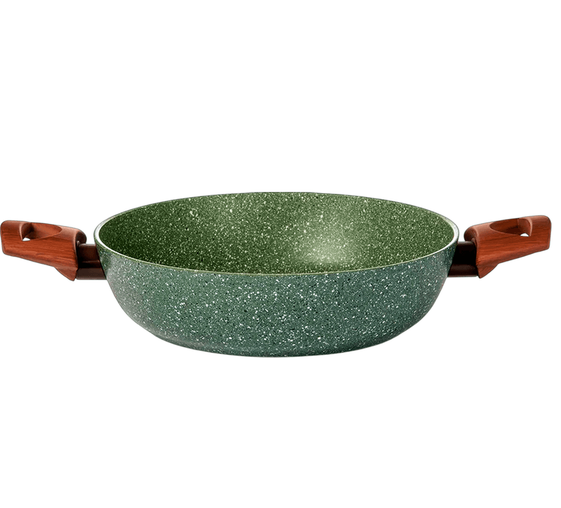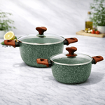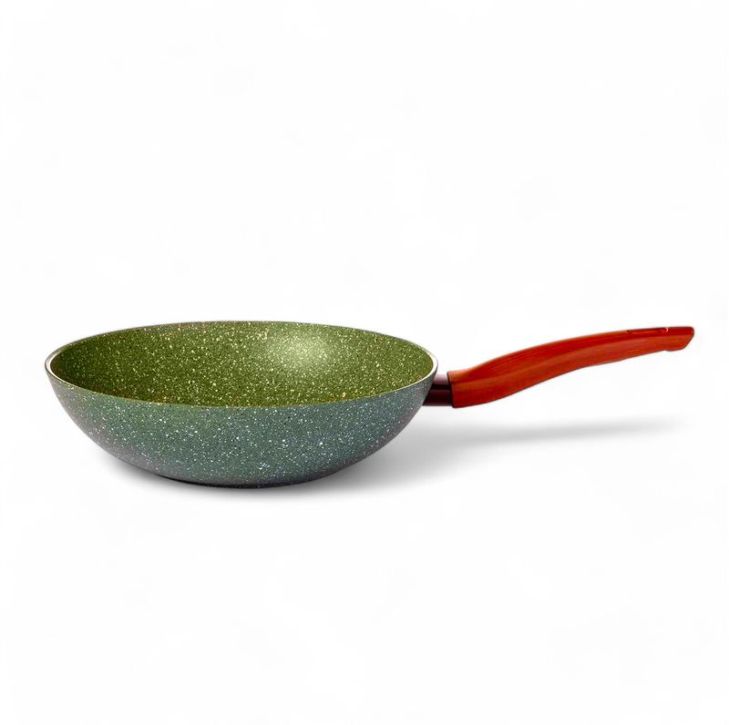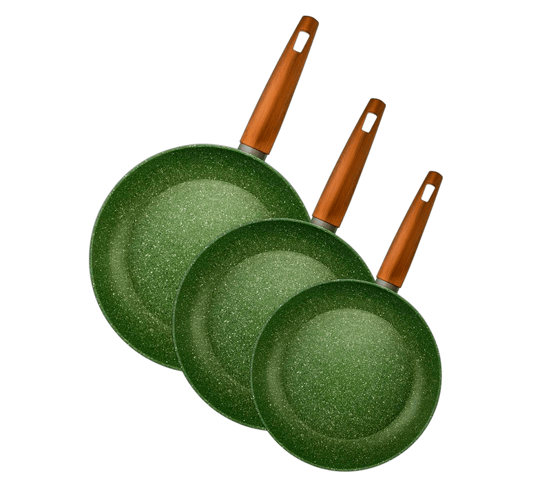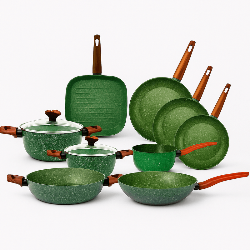 Batería de cocina de 11 piezas, cuerpo de aluminio con revestimiento de 5 capas con efecto piedra tiene un acabado de glicerina vegetal libre de OGM que crea una capa antiadherente extra de forma natural Apta para todo tipo de cocinas, incluida la inducción.