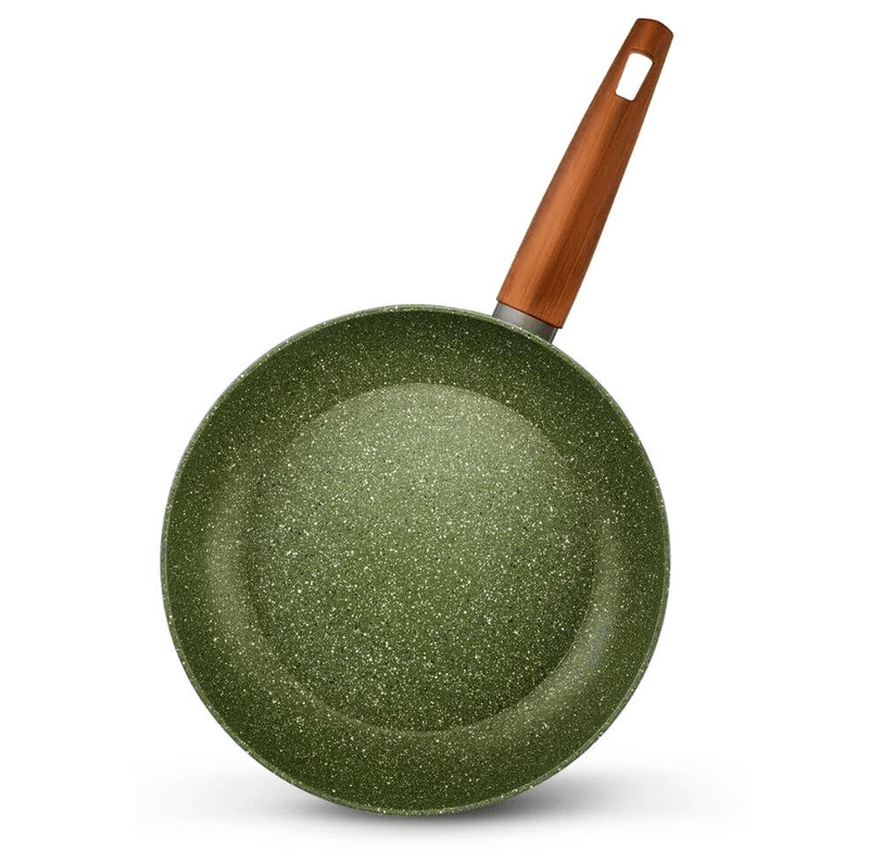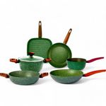 Batería de cocina de 6 piezas, cuerpo de aluminio con revestimiento de 5 capas con efecto piedra tiene un acabado de glicerina vegetal libre de OGM que crea una capa antiadherente extra de forma natural Apta para todo tipo de cocinas, incluida la inducción.