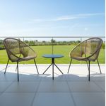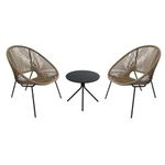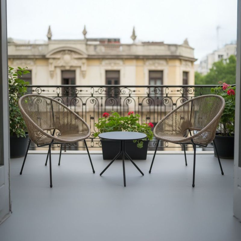 » Descripción: Ideal para balcones, patios pequeños o rincones de jardín, este set bistró de 3 piezas ofrece practicidad y diseño compacto sin renunciar al confort. Incluye dos sillas apilables de ratán sintético y una mesa redonda, todo con estructura de acero resistente.