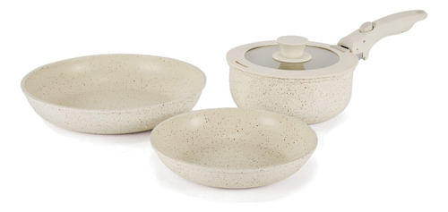 Descubre la batería de cocina antiadherente con sistema de inducción, ideal para optimizar tu espacio. Incluye cacerola de Ø 18 cm con tapa, sartén de Ø 20 cm, sartén de Ø 26 cm y mango extraíble. Sus cuerpos son aptos para horno, y las tapas de vidrio cuentan con salida de vapor. Fabricada con aluminio reforzado y 3 capas antiadherentes, garantiza durabilidad y una cocción perfecta