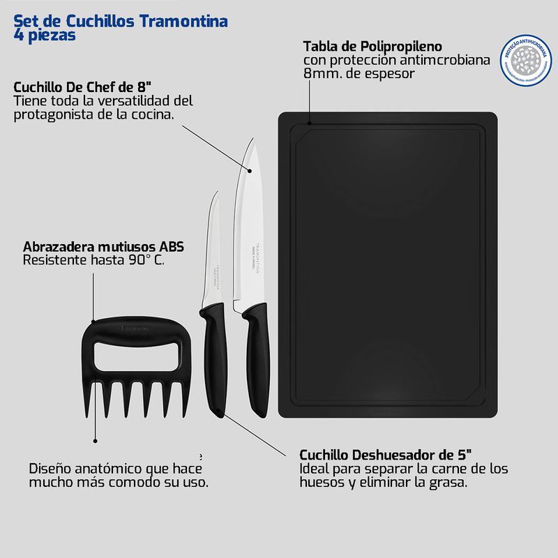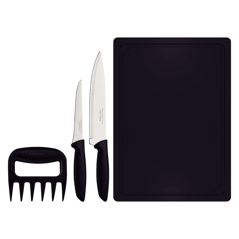 Practicidad y calidad en tu cocina con el set Tramontina Plenus de 4 piezas. Incluye cuchillos de acero inoxidable, garra multiusos y tabla de cortar, ideales para carnes, verduras y más.