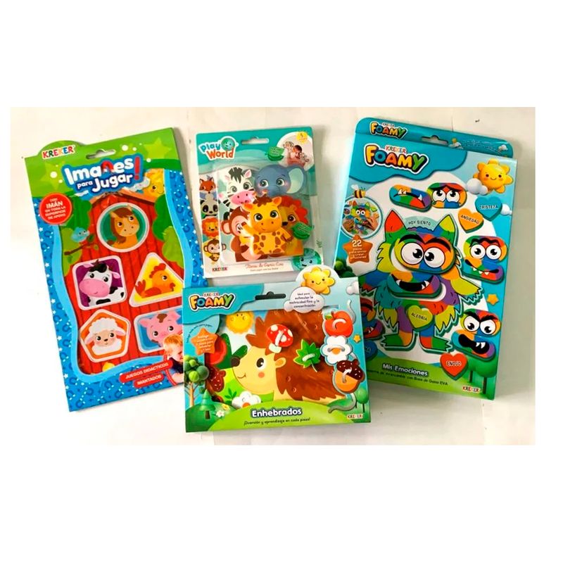Modelo 502: MINI SABIOS. Bolsa 30x40 cm de PVC Cristal con cierre y manija. Contiene Set de 4 juegos didacticos ( 66, 811 , 820, 1042). 66: Incluye 5 piezas imantadas; dimensiones 22 x 35 cm. 811: Encastre con piezas para intercambiar y formar distintas emociones y expresiones; dimesiones 23 x 36cm. 820: Incluye un encastre agujereado con 6 piezas para enhebrar y 1 lazo; dimensiones 23 x 18 cm. 1042: Títeres de goma eva para jugar con los dedos. Blister: 16 x 20 cm.