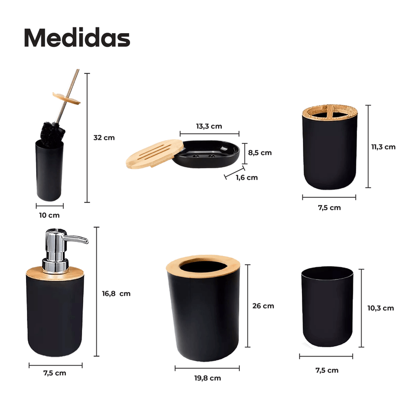 El Set de Accesorios de Baño de 6 Piezas WAGGS combina estilo, funcionalidad y durabilidad para mantener tu baño siempre ordenado y con un toque moderno. Fabricado con materiales resistentes y de fácil limpieza, ofrece un diseño elegante con líneas limpias que se adapta a cualquier tipo de decoración. Incluye todos los elementos esenciales para optimizar el espacio y mantener la organización: dispensador de jabón líquido, jabonera, vaso, porta cepillos, escobilla con soporte y cubo de basura con tapa. Ideal para uso diario, el set asegura practicidad, resistencia al agua y una estética uniforme en todo el ambiente.